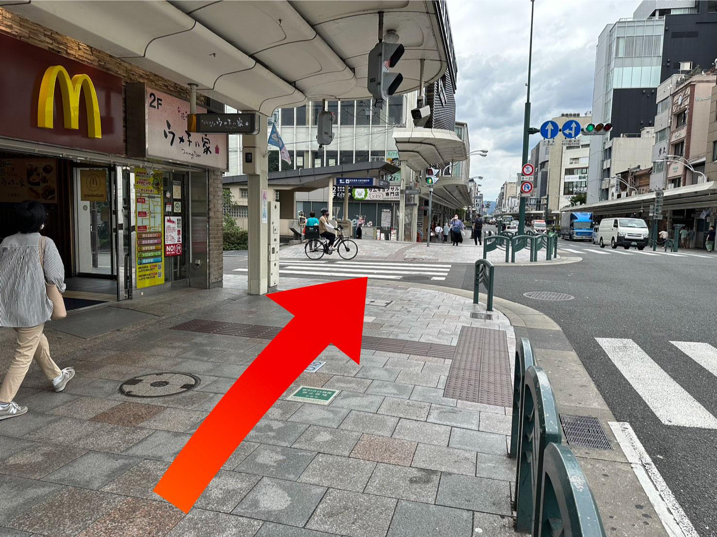 ⑤橋を渡って直進していただき左手にマクドナルド、横断歩道を渡り阪急京都線「京都河原町」駅を通過します。